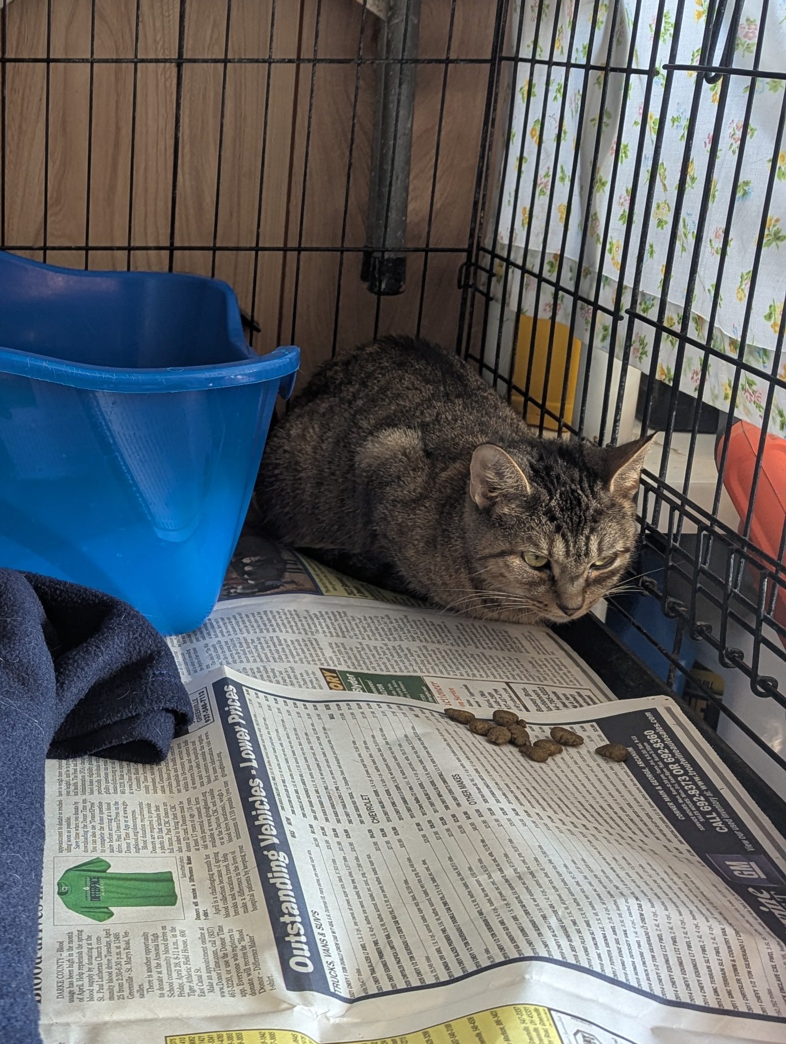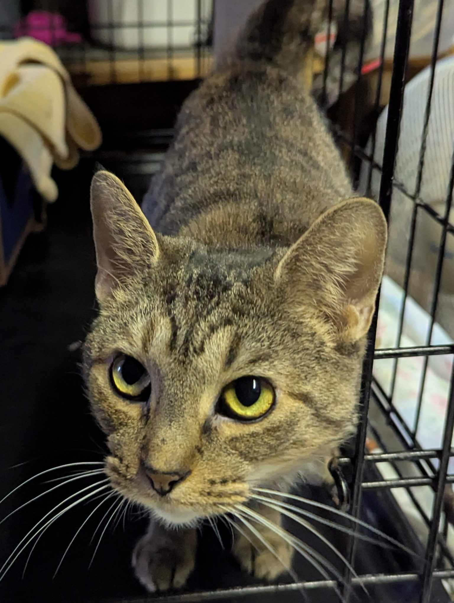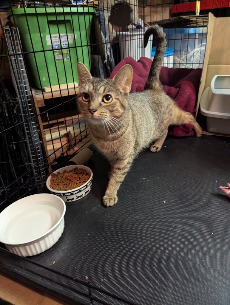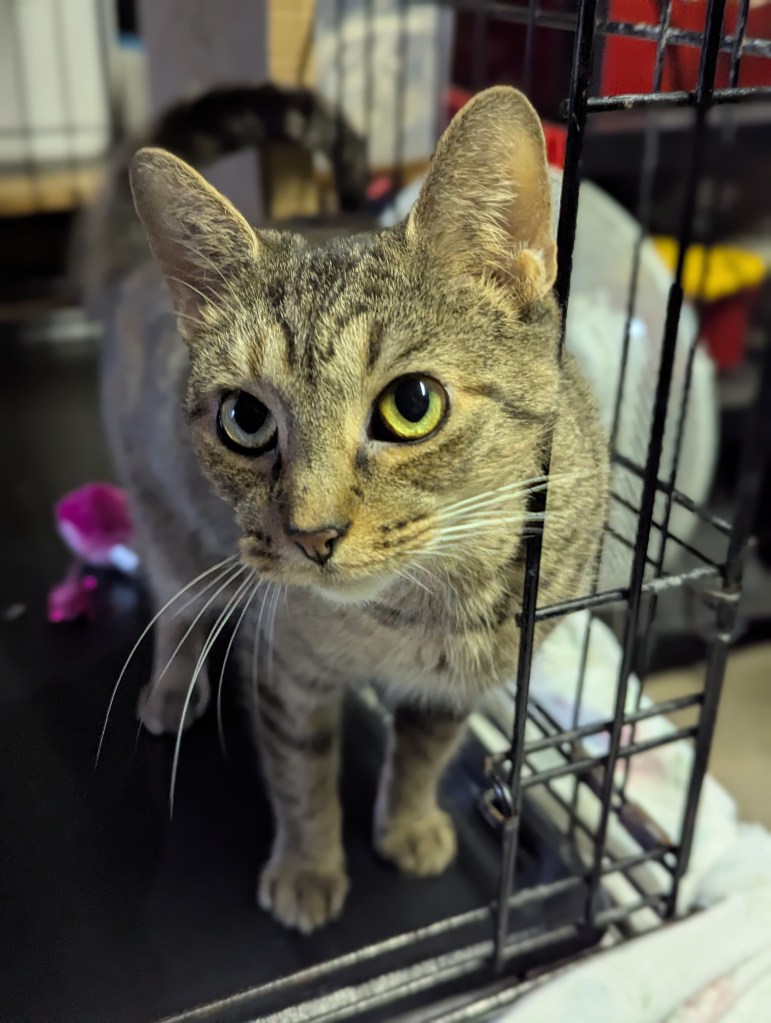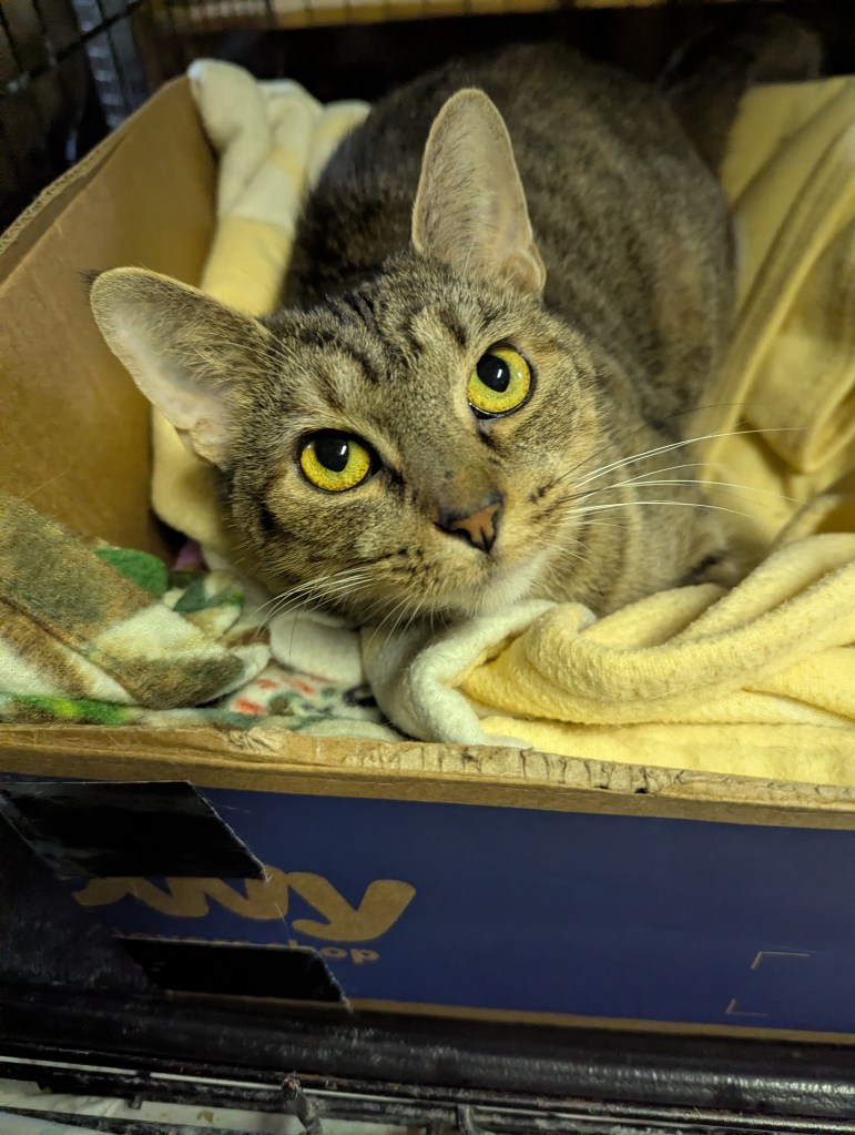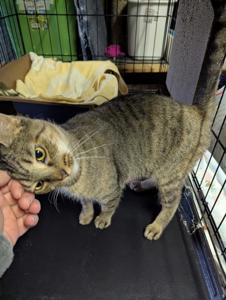 Blaze was one of FIVE cats we took in from a situation where she and her fellow felines were being kept inside a small cage in the back of a car–together. Their owner was dealing with homelessness and didn’t want to leave the cats behind, but keeping the cats in the car that way was also not healthy. Blaze was shellshocked and quiet and took some time to come out of her depression. Now, she is very sweet, loves pets and chatting. She plays and enjoys treats and a little wet food. She would do best in a quieter home, she’s had enough chaos to last a lifetime. She doesn’t mind the company of other cats but it’s unknown if she would tolerate a dog–possibly a chill one. She is fully vetted, combo tested negative, spayed and litter trained. She’s estimated to have a 2022 birthday. She will need to keep her claws and be an indoor only cat. She uses her scratcher like a pro. Screening questions are a must and always in the best interest of the cat.