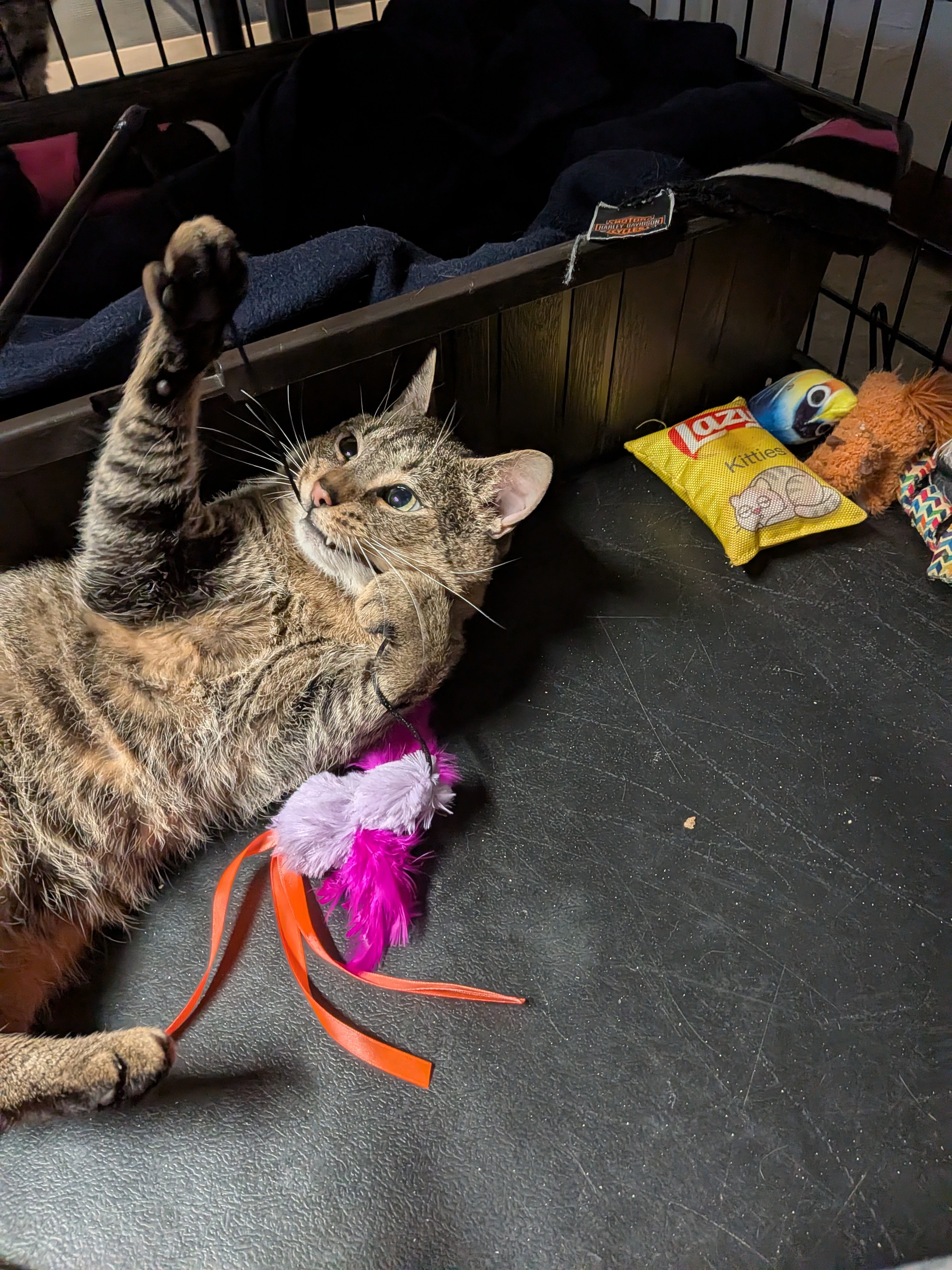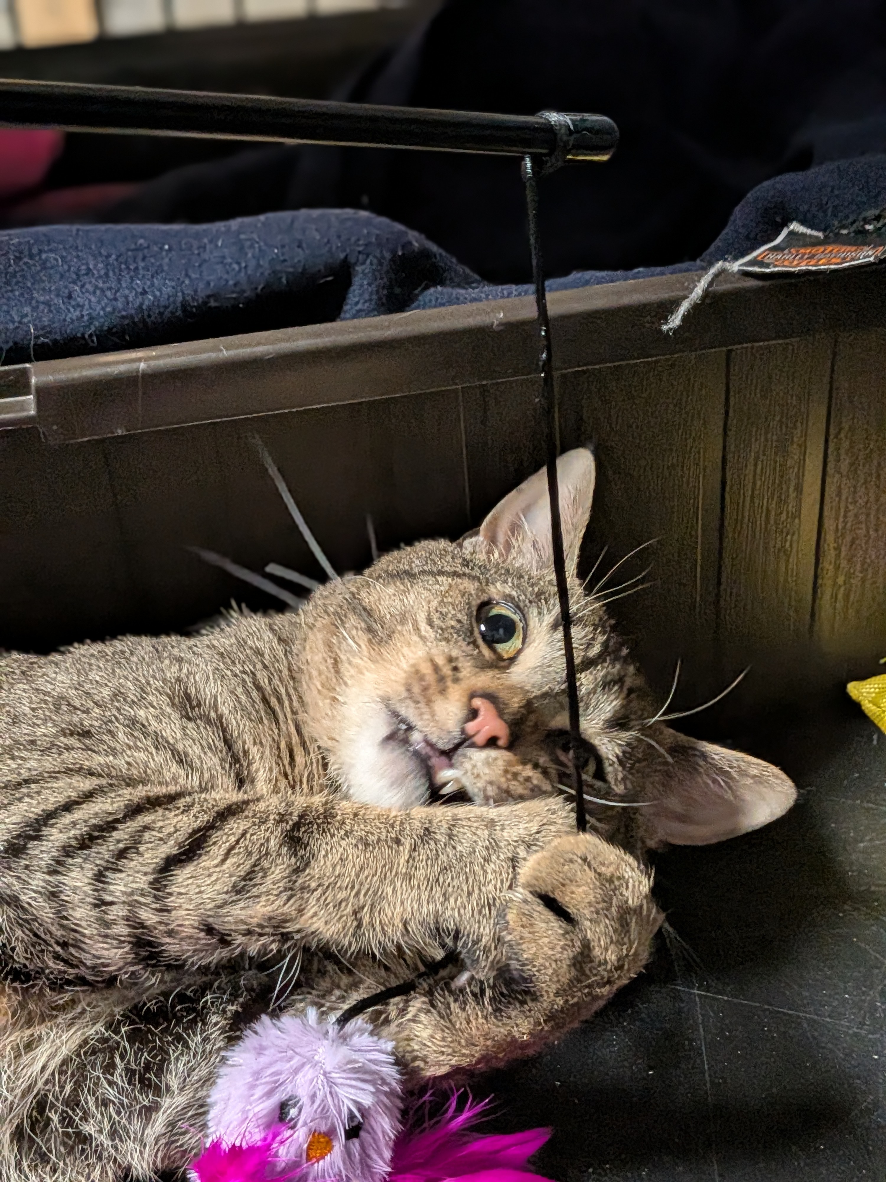 ~~We’ve tried to integrate him into the Cattery with nine other cats, two that were in the rabbit cage with him, and he’s having issues with aggression. He’s jumped two different cats on separate occasions and due to that, he’s had to be kept in his kennel. It’s a multi-level Great Dane sized dog crate in the Cattery but we still wish he could be out with everyone. In the minutes before he attacked, he was playing and watching Cat TV like it was the coolest thing he’d ever seen. We’re thinking he’s getting over-stimulated and his old “Bad Boy” ways get switched on. Up until then, he’s a very playful, loving boy. We hope that the farther he gets from his neuter, the more he’ll calm down, but there is no guarantee. For right now, he will need to be an ONLY CAT. He is fully vetted, combo tested negative, neutered (Feb 5) and litter trained. He will need to keep his claws and be an indoor only cat. He uses her scratcher like a pro.