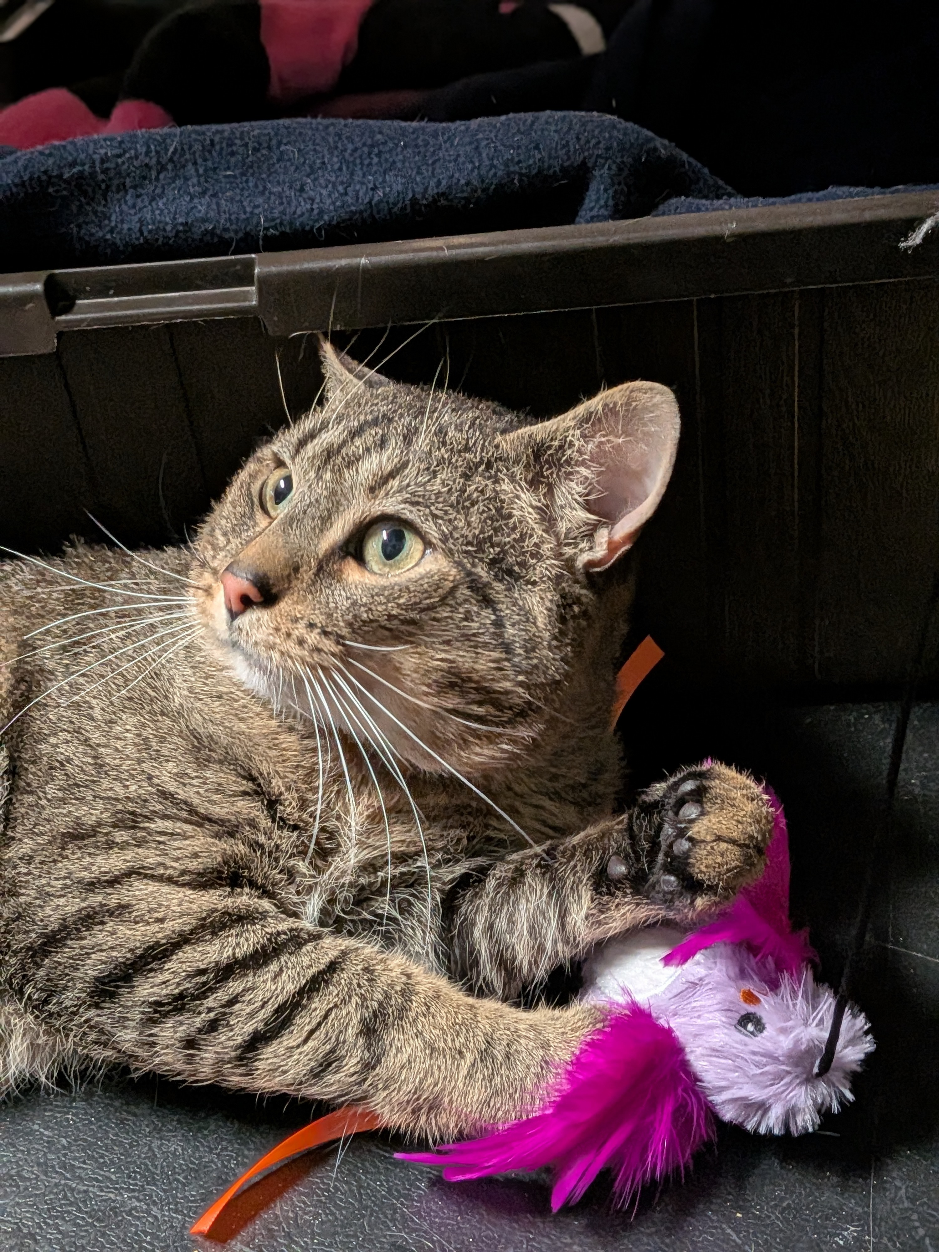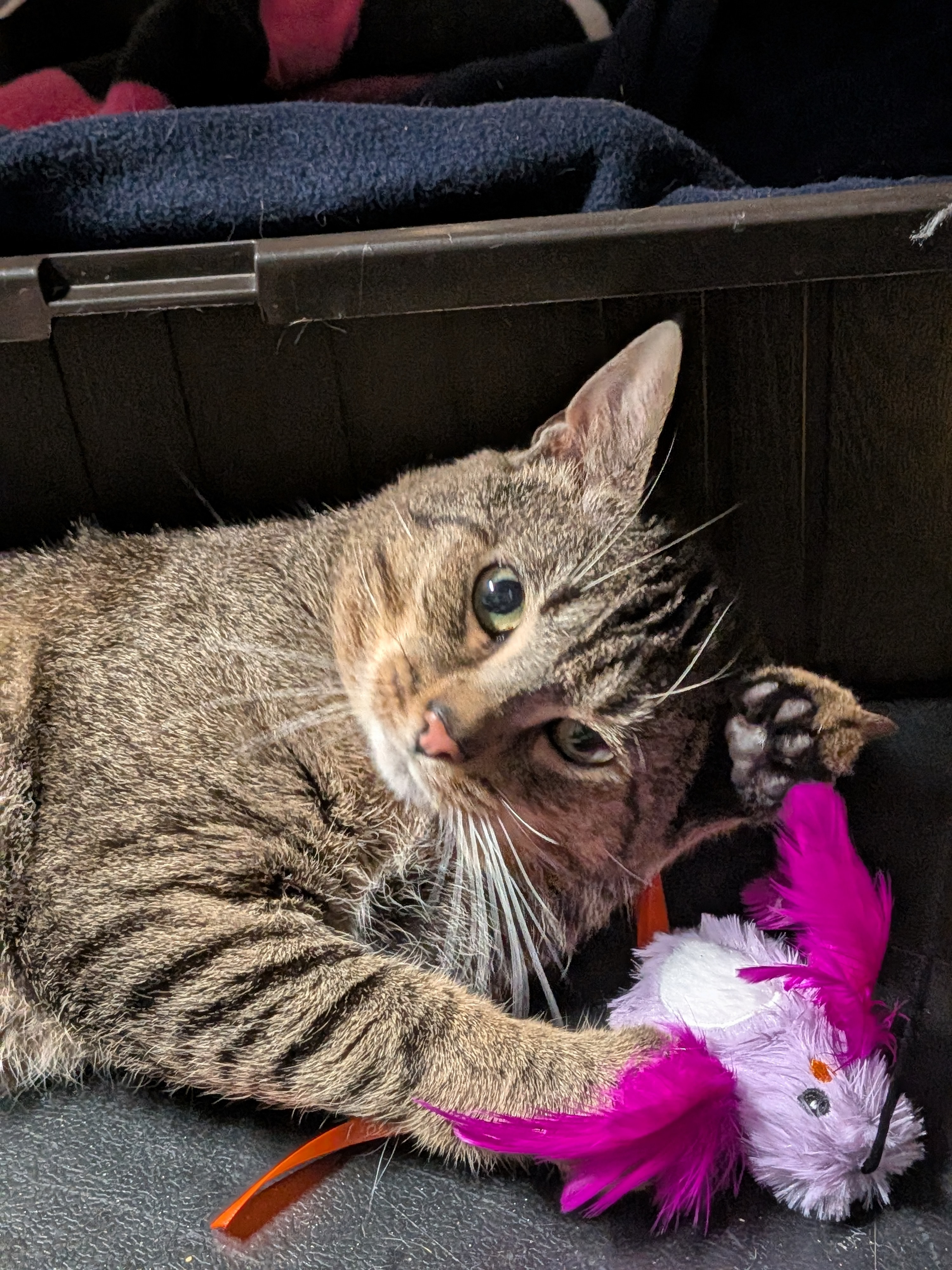 CC was one of FIVE cats we took in from a situation where he and his fellow felines were being kept inside a small cage in the back of a car–together. Their owner was dealing with homelessness and didn’t want to leave the cats behind, but keeping the cats in the car that way was also not healthy. CC was extremely traumatized and in a deep depression for at least the first 10 days he was here. Now, he is doing much better. He gets excited for wet food and will meow insistently when he knows it’s time to eat. He’s very sweet, loves pets and plays with the toys we give him. He is average sized, but quite hulking, being an intact Tom cat (with the jowls to prove it) with a birthday estimated in 2021. He is still mildly timid and will need someone who understands friendship involves trust and can’t be rushed. He does NOT want to be picked up and seems to have a lot of anxiety related to that. We’re working on it, but there’s no guarantee he’ll ever be happy about it. He will need a quiet home with much older children or none at all. Due to the circumstances, so much is unknown about his personality, but he’s never been aggressive, though absolutely terrified. His favorite things to do are get pets, lay in a lap, play and get his daily “goodie food.”