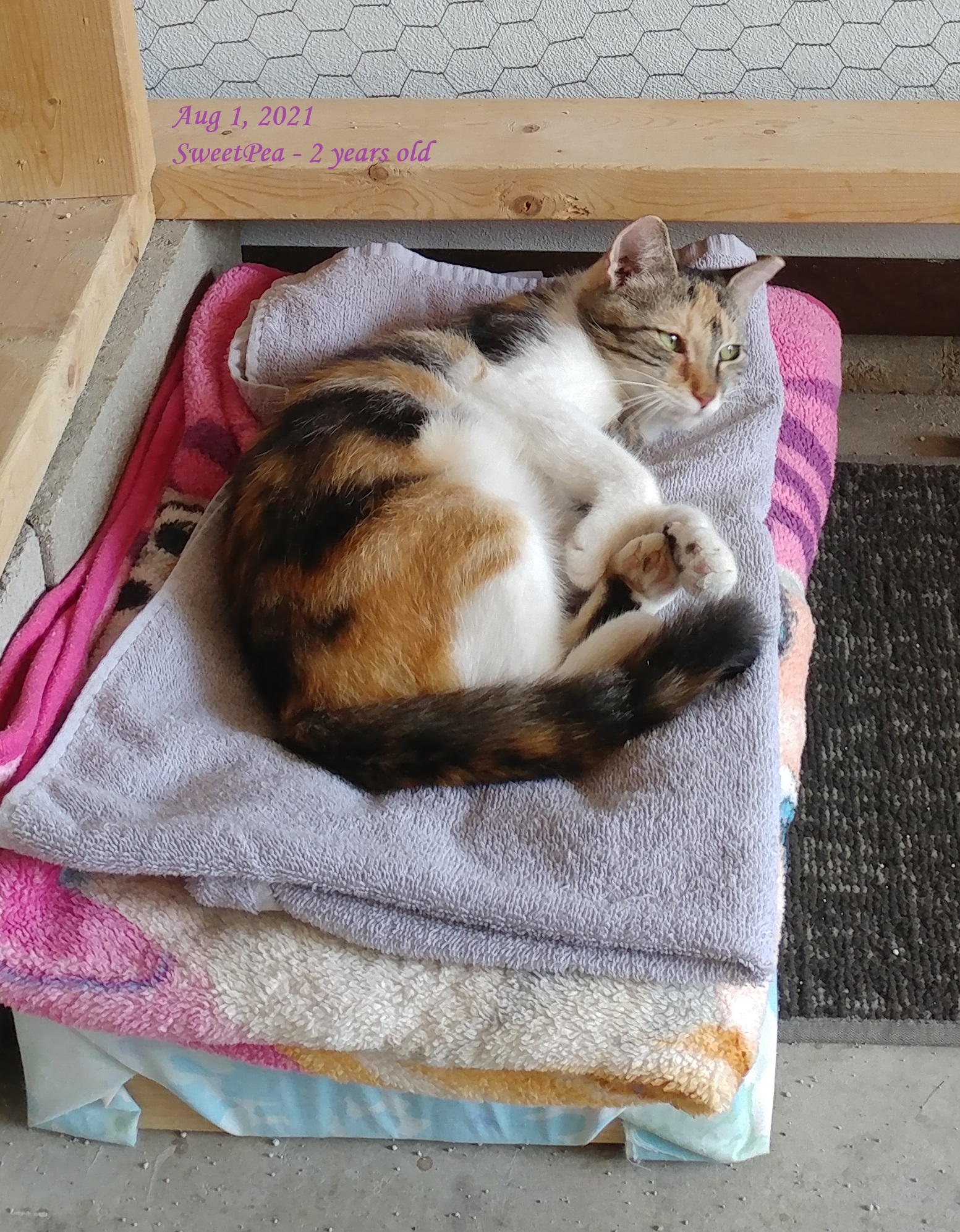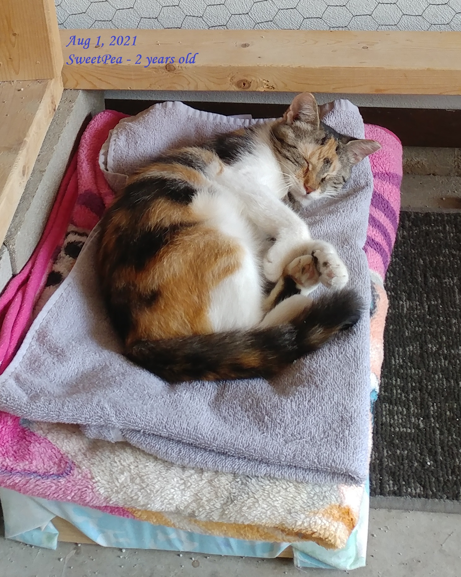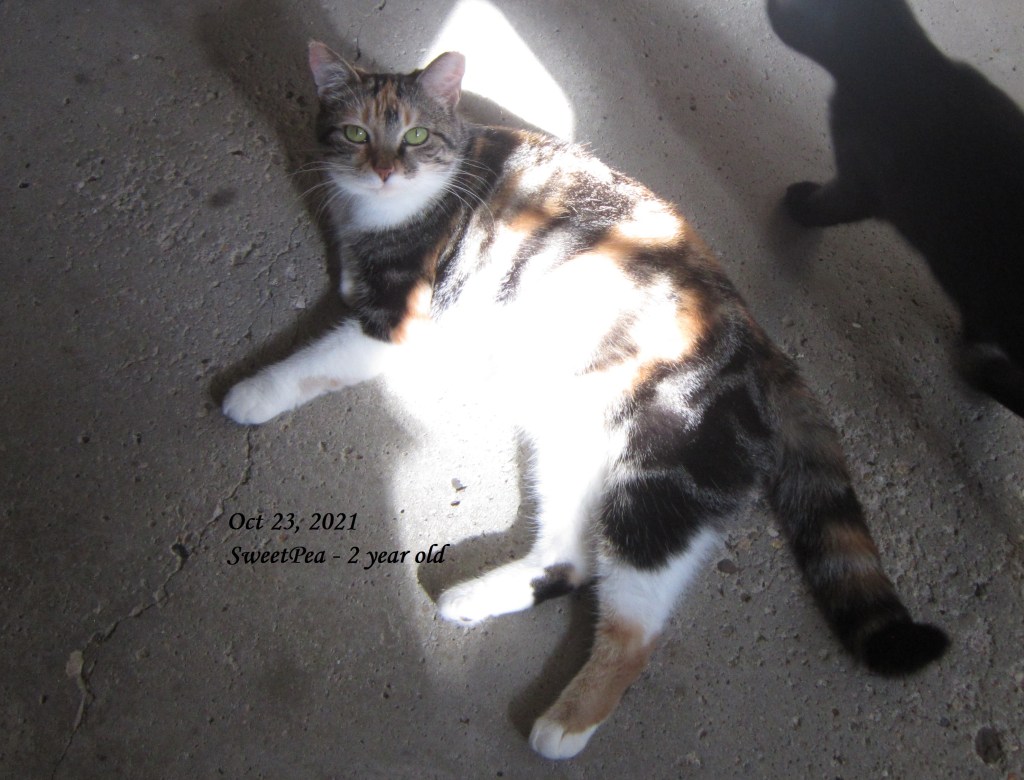 This lovely calico was a barn cat at a location that was about to be sold. She had three kittens a few days before I collected her on April 14, 2021. She willingly took on three more kittens a few days later when presented with the orphaned newborns. She was a very good mom and continues to mother my remaining foster kittens. She herself isn’t much more than a kitten at approximately 2 years old. Her birthday is approximately September 13, 2019.