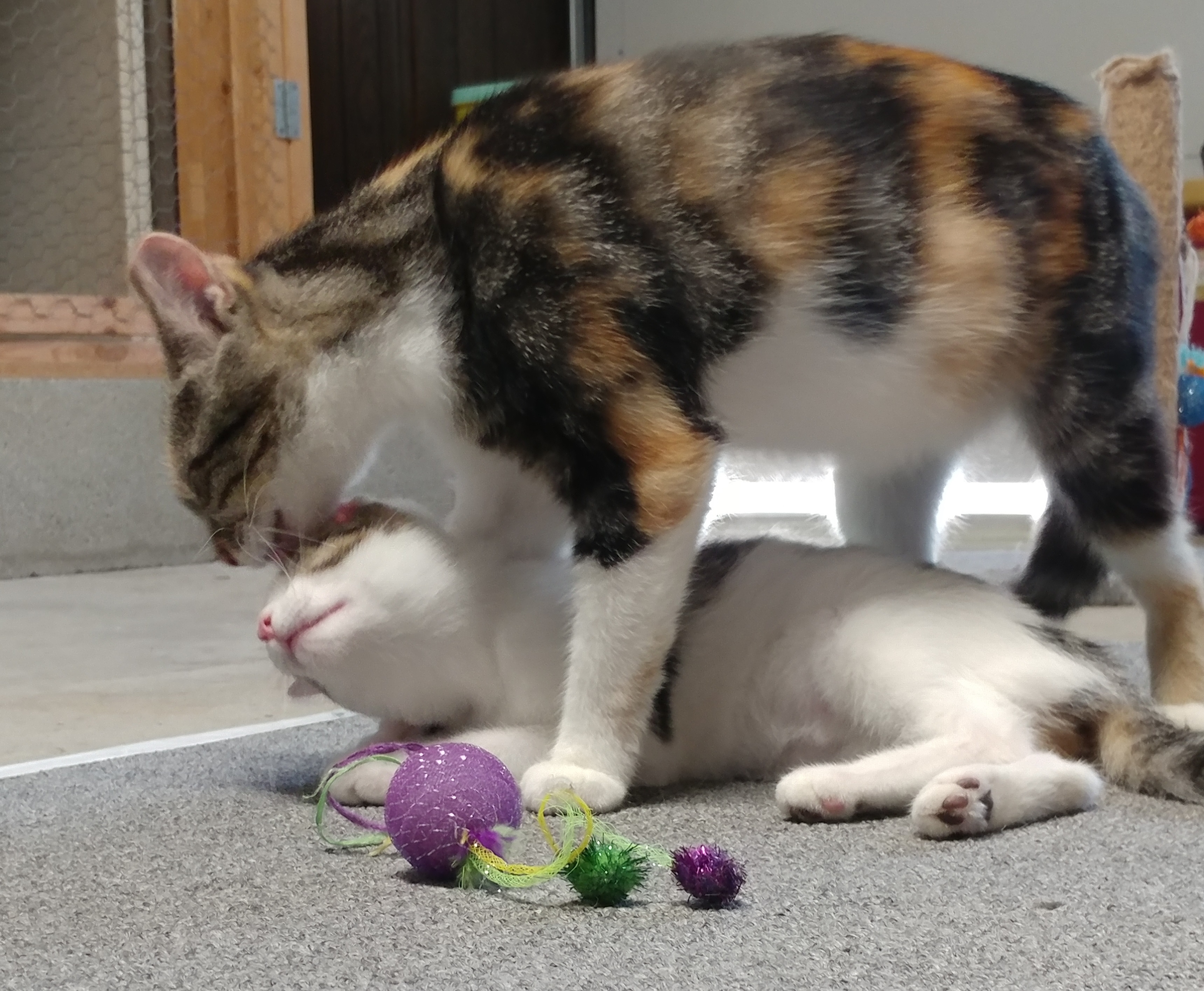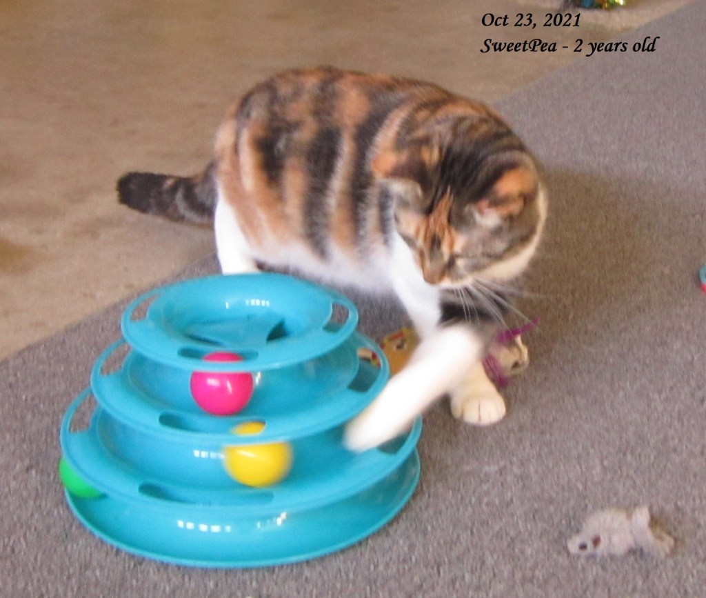 She loves her head and ears scratched, a good scratching post, and to chase ball toys. They’re her favorite and she’s quite the soccer player. She is also intensely playful with wand toys. She doesn’t care to be held (unless you do it JUST so), but also has never scratched me while I tried, only squirmed. The farm she came from had a small dog, but it’s been a long time since she’s been around one.